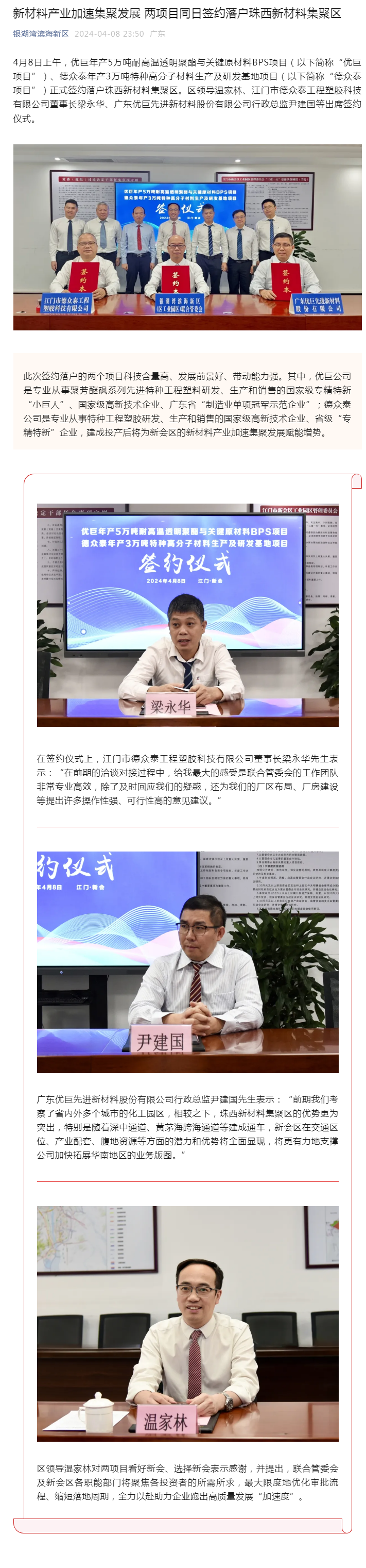 德眾泰年產3萬噸特種高分子材料項目正式簽約落戶珠西新材料集聚區(qū)